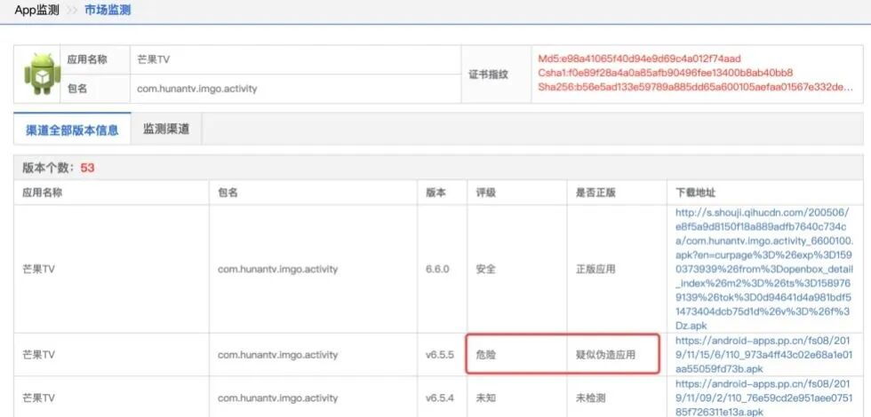 安全监测:对APP程序的安全漏洞、APP恶意行为、APP漏洞分布、APP地区分布以及扫描数量进行图表统计展示。渠道监测:实时监测国内多个应用市场,可及时发现钓鱼伪造APP、老旧版本APP等相关数据。