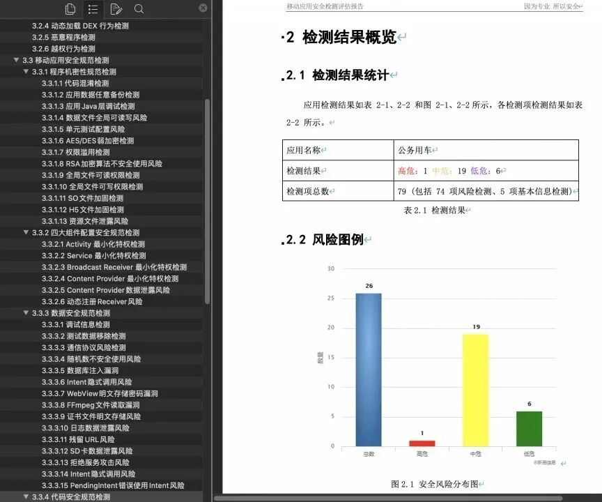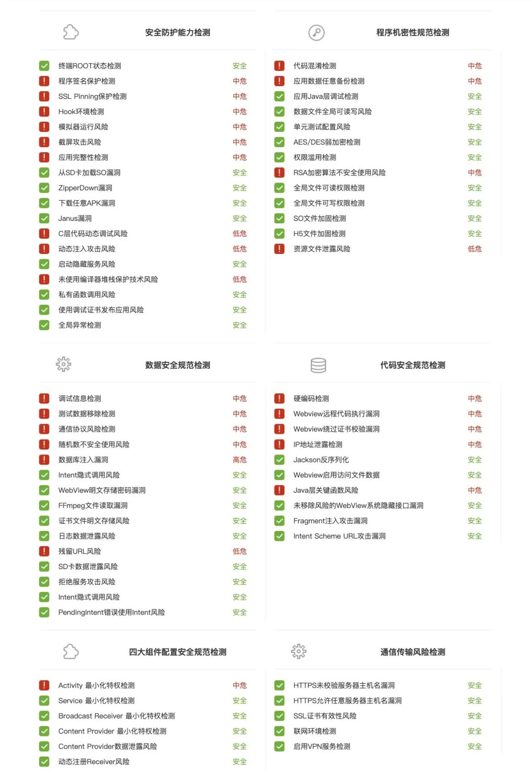 依据相关行业标准,对测试项进行优化改进,分别适用于Android和IOS端检测。通过从安全防护能力检测、程序机密性规范检测、数据安全规范检测、代码安全规范检测、四大组件配置安全规范检测和通信传输风险检测六大方面对APP进行安全风险评估。
