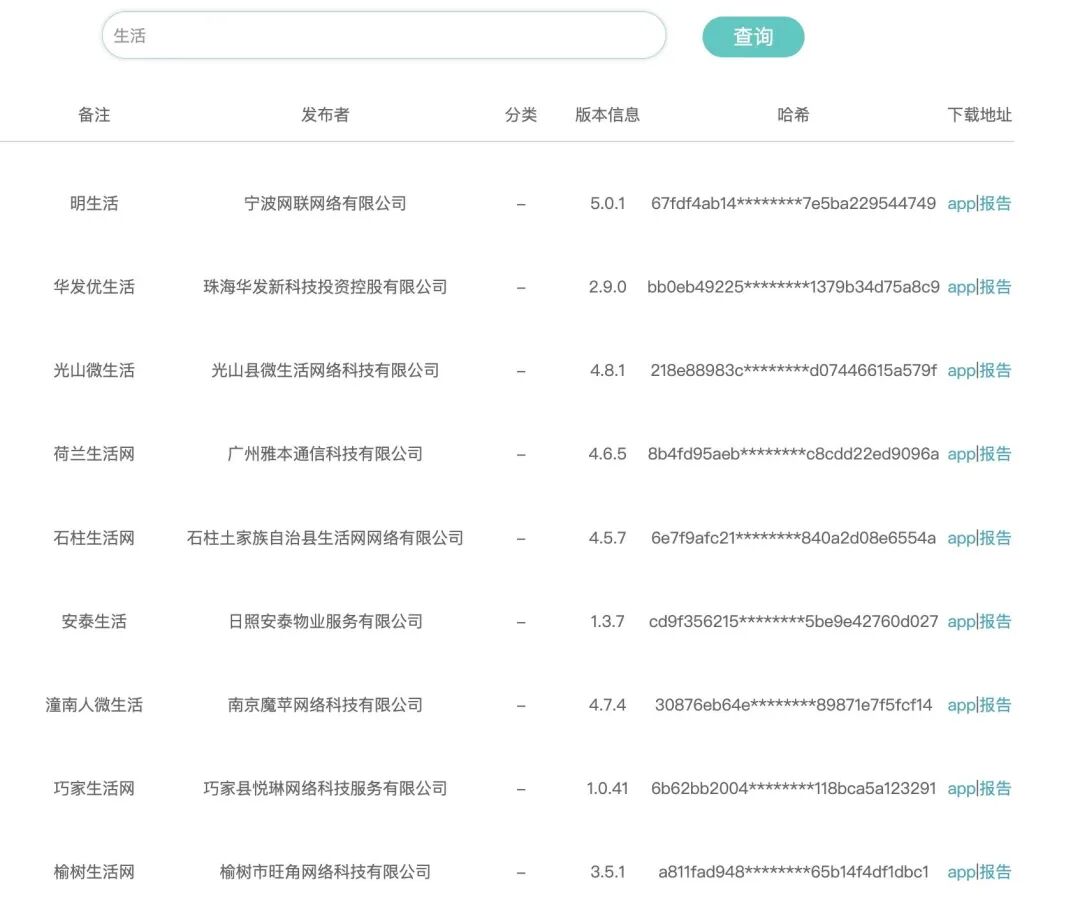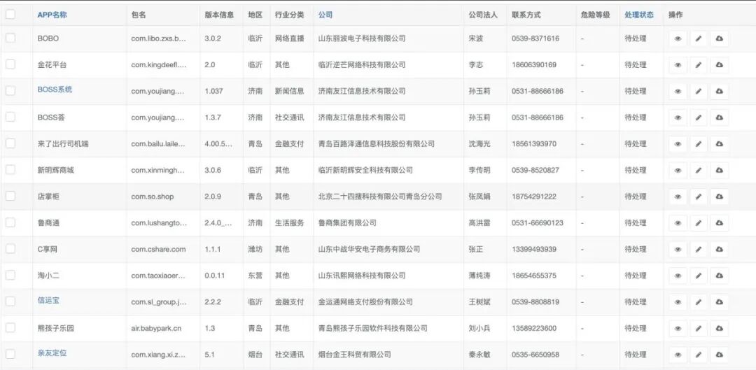 移动端安全管控平台通过监测国内各大主流手机应用市场,进行全网规则匹配,对市场已上架的APP信息进行筛选存储。APP基本信息包括应用的名称、包名、运营单位、属地、分类、渠道、历史版本、更新时间、服务器、域名和概述等关键属性,可方便的对APP进行定位检索。