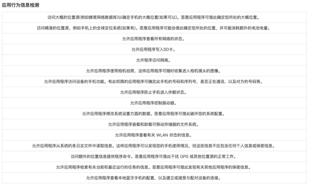 通过对APP进行反编译提取该APP配置文件中的权限列表,比对各类APP权限调用情况,在用户未授权的情况下获取涉及用户个人信息的行为,采用静态检测方式进行判断,实时监测存在调用系统等危险权限行为,对使用危险和敏感权限的APP进行全库监控。检测出的含有恶意行为的APP将会被标记,并显示该恶意行为,如读取该手机短信内容、通话录音等行为。