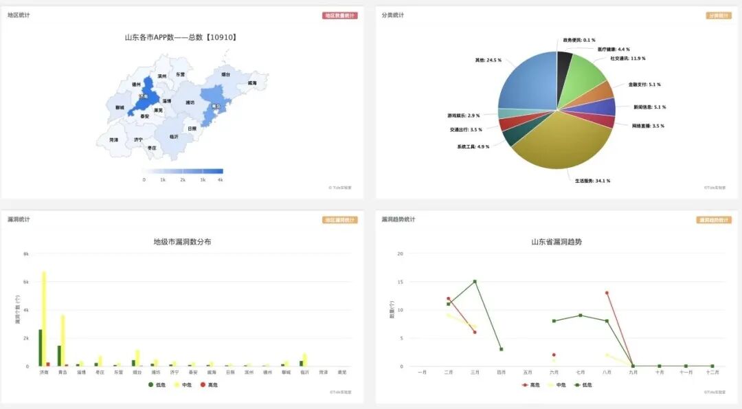 对辖区范围内APP风险检测数据进行汇总展示,对各漏洞数量占比进行图表展示。