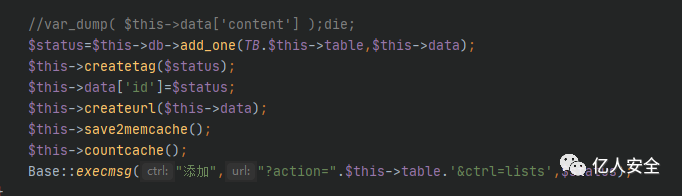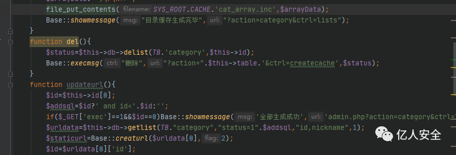 筛选到cms类中的updateurl方法存在该函数调用,分析前后发现$addsql参数是由$id参数组合而成的,那么也很明显的存在注入,id没有经过处理。