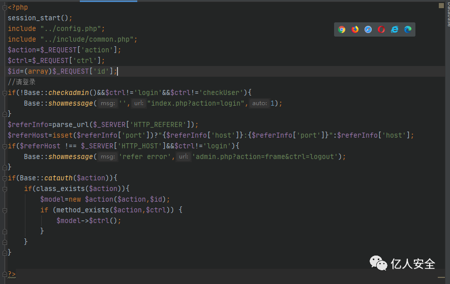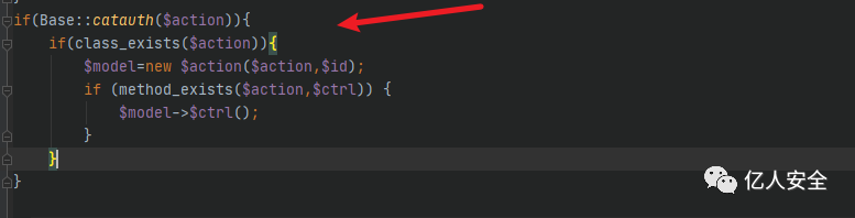 先会调用Base类中的catauth方法对$action参数进行判断,之后会判断是否存在相应的类,如果存在的话就实例化该类并赋值给$model,并且会判断$ctrl方法是否存在于$action类中,存在的话就会调用类中无参方法