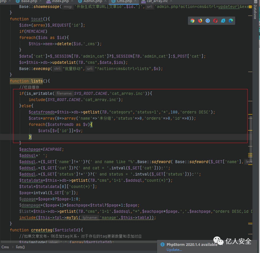 这里代码37行的 $o 也就是对应代码49行的 $cat 数组中的内容是从数据库中 cms_category 表中获取的。那么如果这里表中的内容是我们可以控制的那么就能写入任意内容。