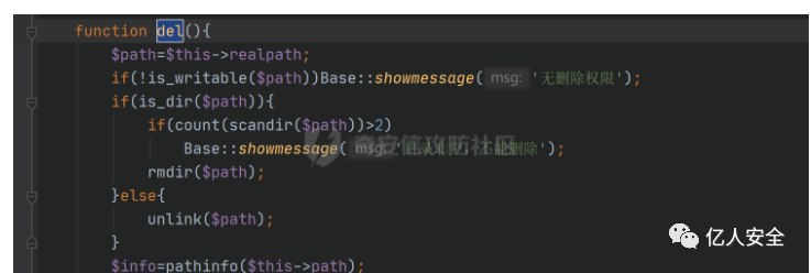 这里会对指定绝对路径要删除的文件的全选进行判断,并且如果是文件夹的话会遍历文件夹并判断文件夹是否为空,之后就会直接进行删除的操作,加上目录穿越就可以进行任意文件删除了。