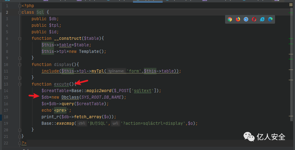 在Sql类下的 excute() 方法,依旧的简洁明了。通过14行传入 $sqltext 参数也就是我们的SQL语句,