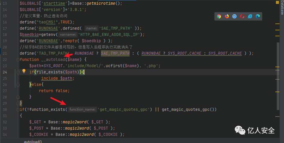 在common.php中22行代码处中调用__autoload() 魔术方法来加载 Model 文件夹下的功能代码,方便后续路由的调用。在代码30行去除 get_magic_quotes_gpc() 方法对特殊字符加载的反斜杠,这可能是为了代码的兼容性。