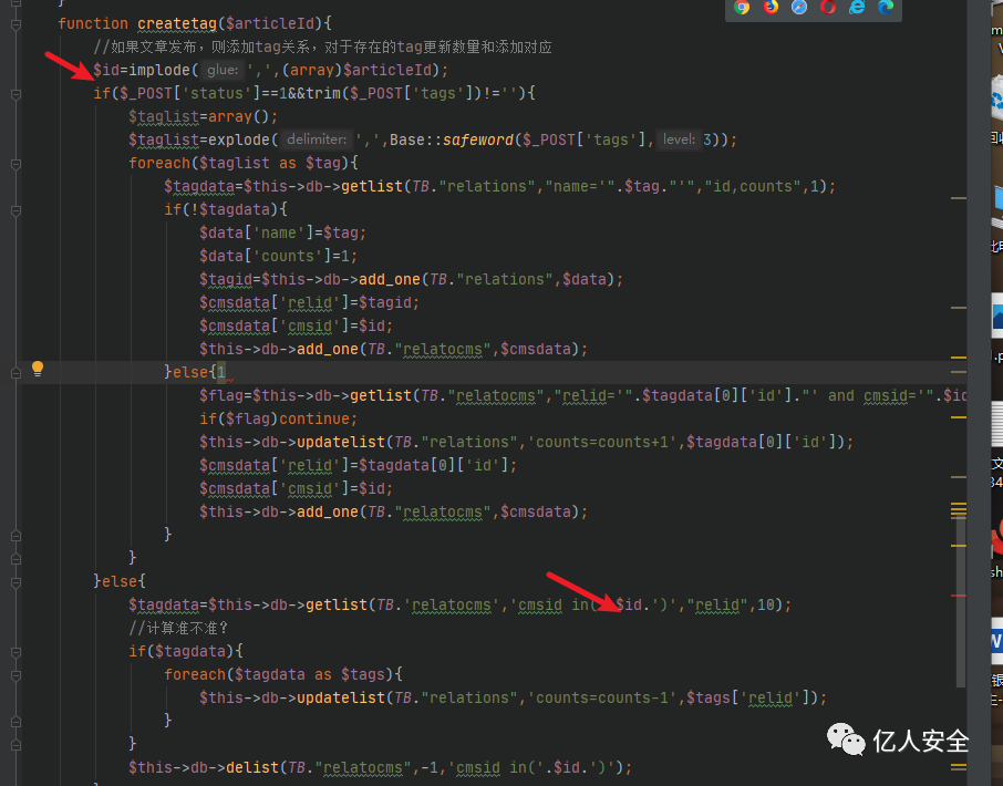 可以看到传参值也是id,而id在加入sql语句前也没有进行安全处理,只针对tags参数进行过滤,但是我们这个删除执行很明显没有传递tag参数,所以走的是下面的else语句,成功拼接到语句中,根据之前阅读的方法知道,delist、getquery、updatelist、get_one、getlist这几个函数中没有对输入值进行过滤,执行我们的payload。