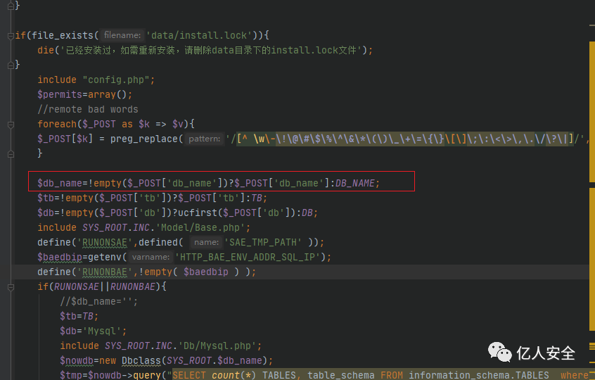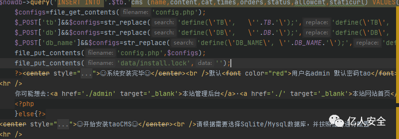 可以看到这里先调用file_get_contents读取了配置文件当中的内容,接着调用了str_replace将默认值替换成了POST中传入的参数值,这里其实三个参数都能够写入shell文件,这里对db_name进行写入shell