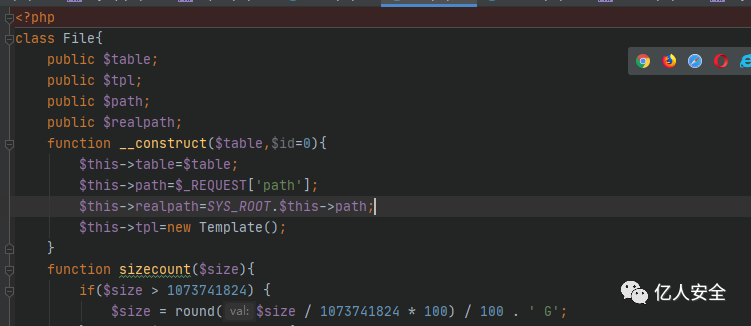 根据File类的构造方法,以及前面传入的参数,$id是可控的,但是没有赋值默认为0,$table即是$action=file,接着这里会对指定文件的真实路径进行拼接,这里的SYS_ROOT就是整个项目的绝对磁盘路径。
