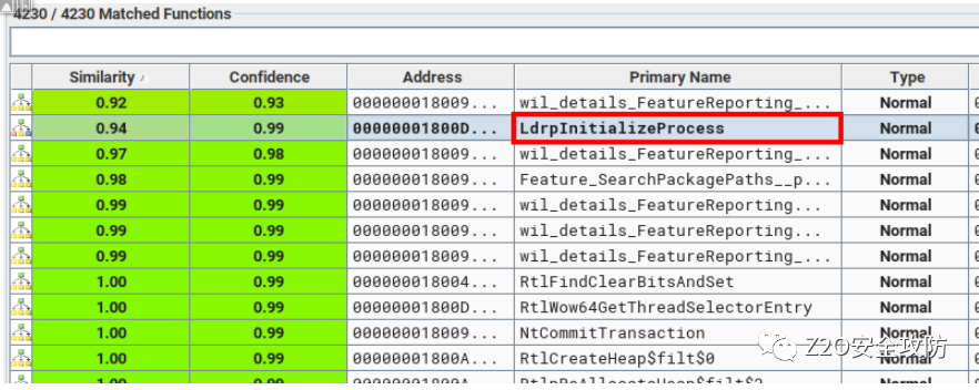 然后可以将这两个“BinExport”文件导入到 BinDiff 中,以比较两个版本的ntdll.dll. 通过按“相似性”对功能进行排序,我们可以立即看出 7 个功能之间存在一些细微差异,但真正脱颖而出的是:LdrpInitializeProcess. 这正是我希望找到一些变化的地方。