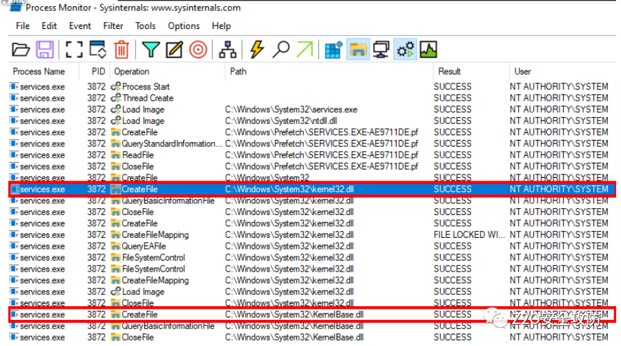从最初的事件中,我们已经可以看出有些事情没有按计划进行。由于services.exe作为 PPL 执行,我们不应该在 DLL 上看到任何文件操作(例如 CreateFile或CreateFileMapping)kernel32.dll,KernelBase.dll因为这些是已知 DLL。相反,它们应该直接从各自的部分\KnownDlls\kernel32.dll和\KnownDlls\kernelbase.dll.