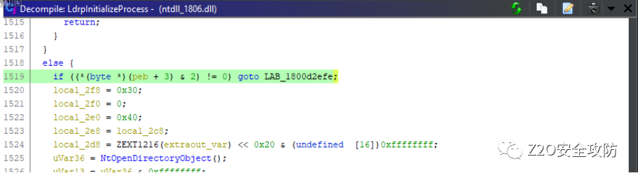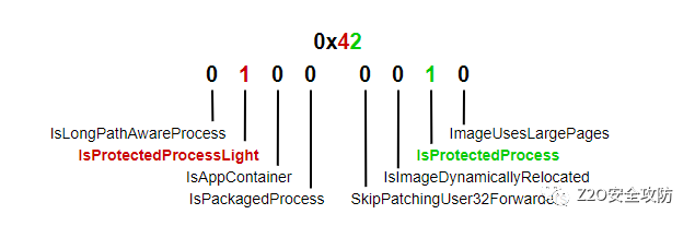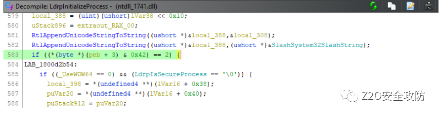 有了这些知识,我们可以将代码翻译*(byte *)(peb + 3)成peb->BitField. 然后,该值0x42是一个掩码,允许加载程序隔离和检查标志IsProtectedProcess和IsProtectedProcessLight。因此,反编译后的代码if ((*(byte *)(peb + 3) & 0x42) == 2)可以解释如下。