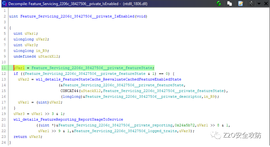 根据 Ghidra 生成的反编译代码,该函数似乎首先检索全局变量的值Feature_Servicing_2206c_38427506__private_featureState,如果尚未初始化则对其进行初始化,然后返回其第四位 ( uVar1 >> 3 & 1) 的值。