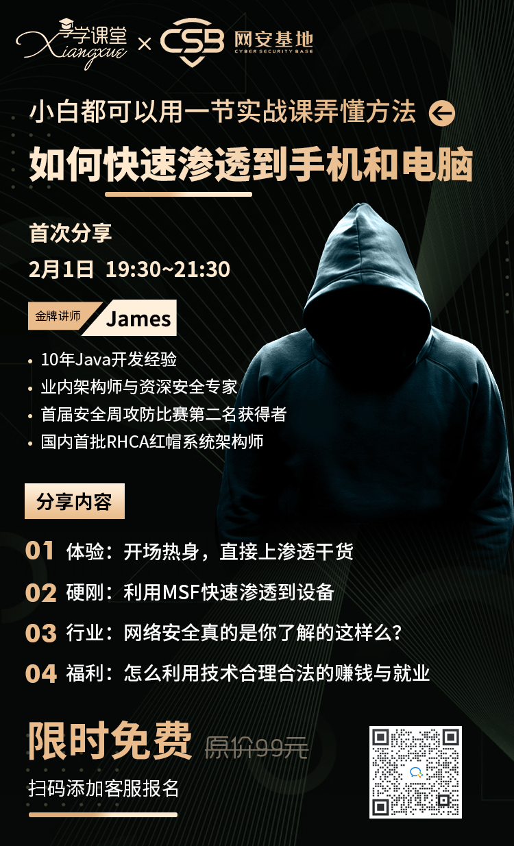 为了帮助早日进阶成为一名黑客,笔者特邀阿里云首席网络安全专家James老师为大家带来《如何快速渗透到手机和电脑》系列直播课程