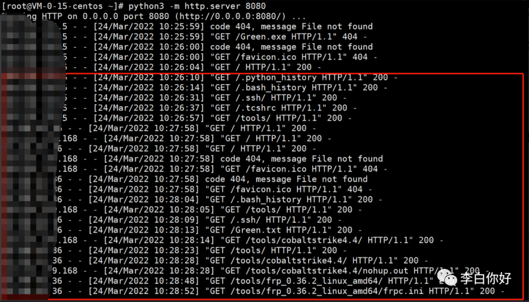 2、经过Python http服务的日志分析,可以观察到一些敏感文件已经被防守队提取,".bash_history"、"frpc.ini"等等。需要立刻查看这些文件的内容,模拟防守队在得知这些内容后可能带来的危害,再对当前服务器进行加固。