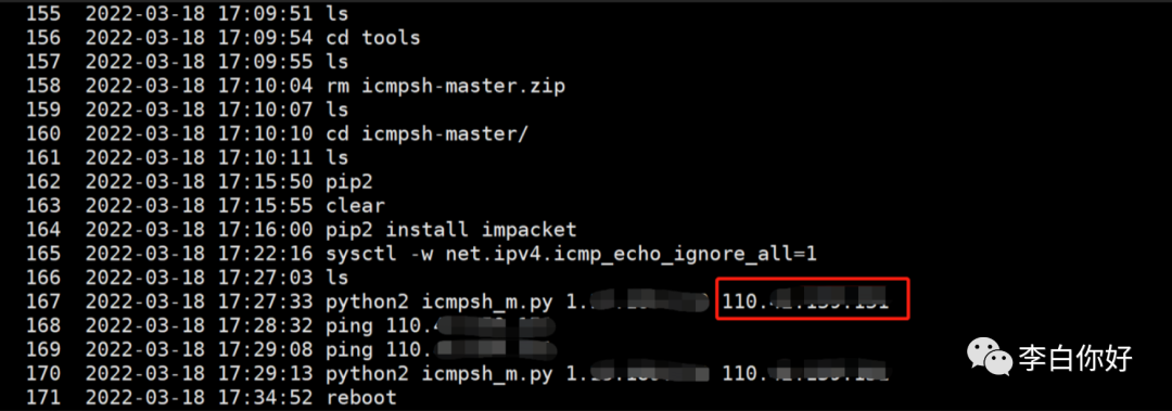 (1)历史搭建icmp隧道的命令行记录,其中包含当前服务器 IP(1.x.x.x)和我们的C2服务器IP(110.x.x.x),可以认为防守队获得了另一台我们用于攻击的服务器IP(110.x.x.x)。