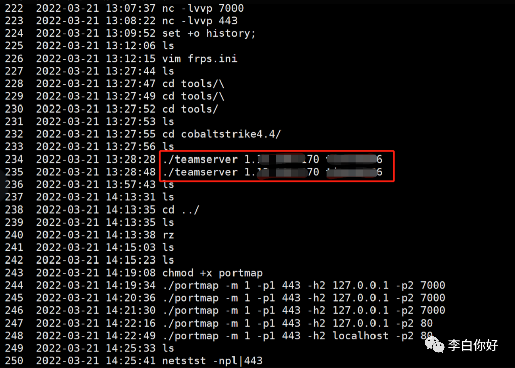 (2)历史CS teamserver(1.x.x.x)的启动记录,不过幸好我们的CS搭建在另一台服务器(110.x.x.x)上,且默认端口已经做了修改,这条命令只是当时测试CS用到的命令,不过仍然泄露了历史使用过的CS密码(xxxxxxx6),而这个密码恰好也用在了我们的C2服务器(110.x.x.x)上。
