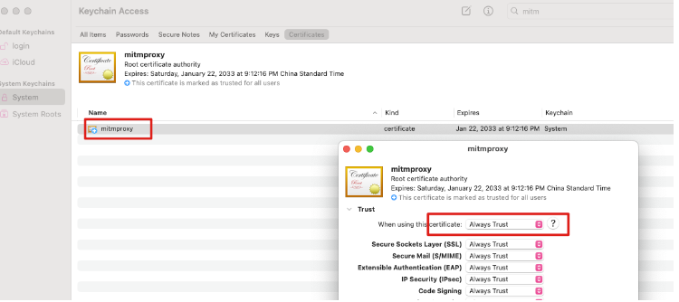 5、下载安装后,打开钥匙串访问,找到mitmproxy证书,修改为alwaystrust