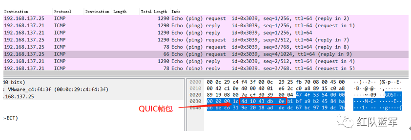 QUIC协议是一种加密协议,通过流量无法直接观察数据内容。但是从流量数据包的长度上看,ACK帧的长度远小于STREAM帧,而常规的ICMP协议的Echo类型报文数据长度往往都是相同的。