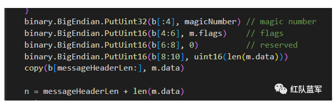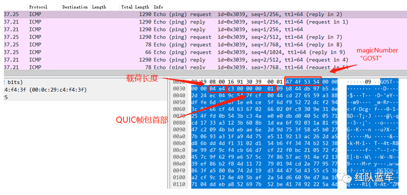 ICMP隧道传输的数据,由两部分构成:MessageHeader和QUIC数据。MessageHeader的长度固定10个字节,前四个字节存放magicNumber,默认为固定字符串“GOST”,最后两字节存放后续载荷的长度。