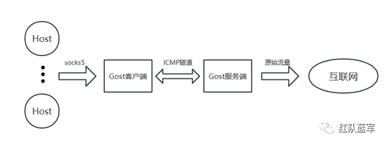 隧道的搭建需要客户端和服务端两端,客户端负责接收socks5代理协议,解析后将数据封装成ICMP协议发送到服务端,服务端接收后解析成原始流量并转发。