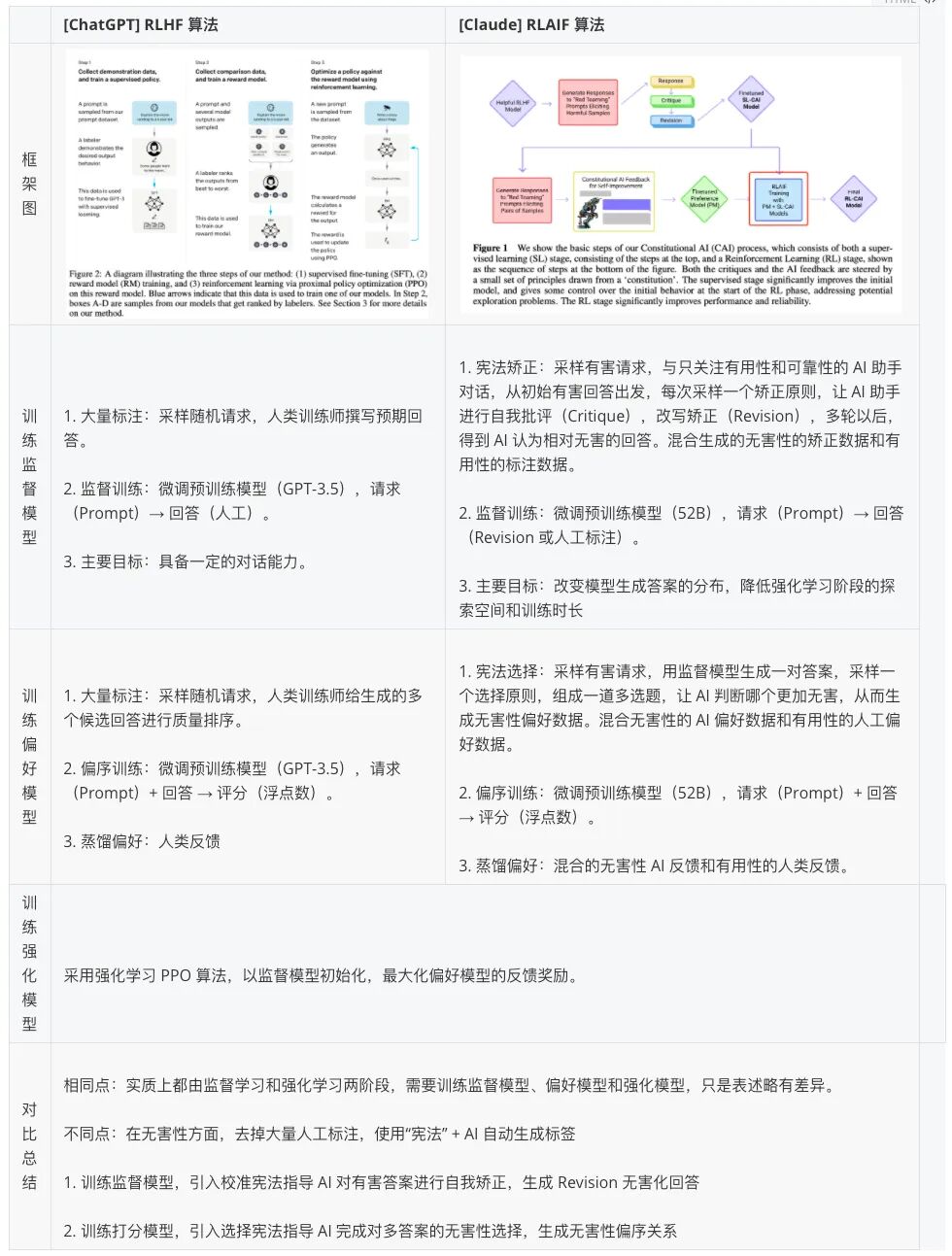 如前所述,有别于 ChatGPT 的 RLHF 算法,Claude 模型提出了 RLAIF 算法。我们在下面对比两种实现的差异: