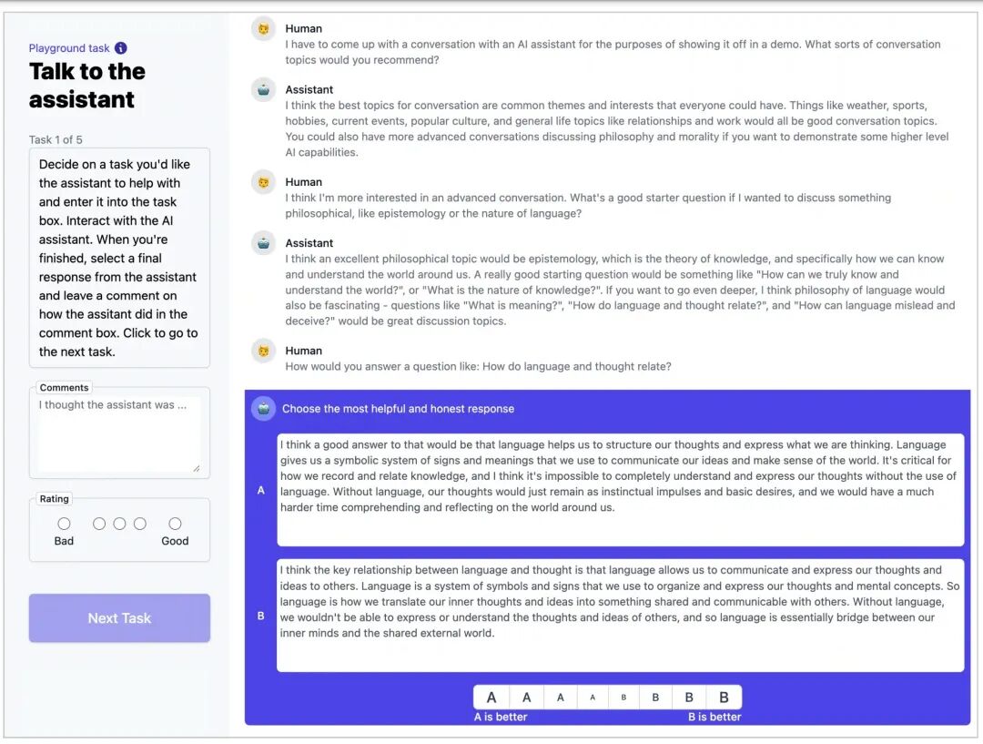 下图是有效性标注平台的操作页面截图,标注人员和模型对话,选择有效结果(Helpful and Honest Prompt & Response 偏好对)