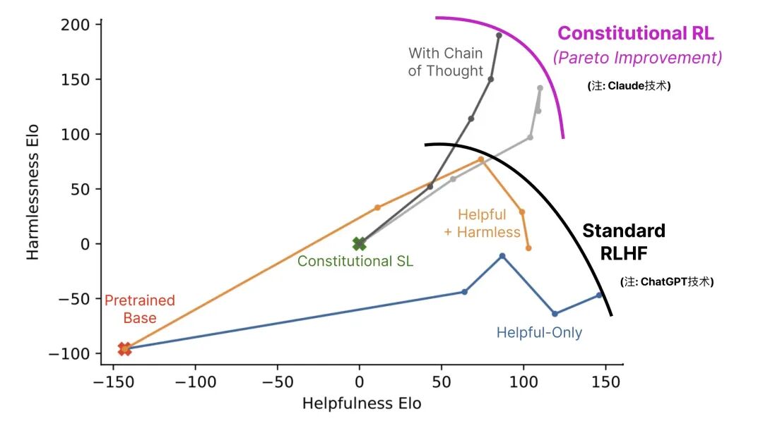 黑色线(RL-CAI w/ CoT):RLAIF 模型,通过 AI 反馈的强化学习 + 思维链(Chain-of-Thought, CoT),有效性略弱,无害性显著强。