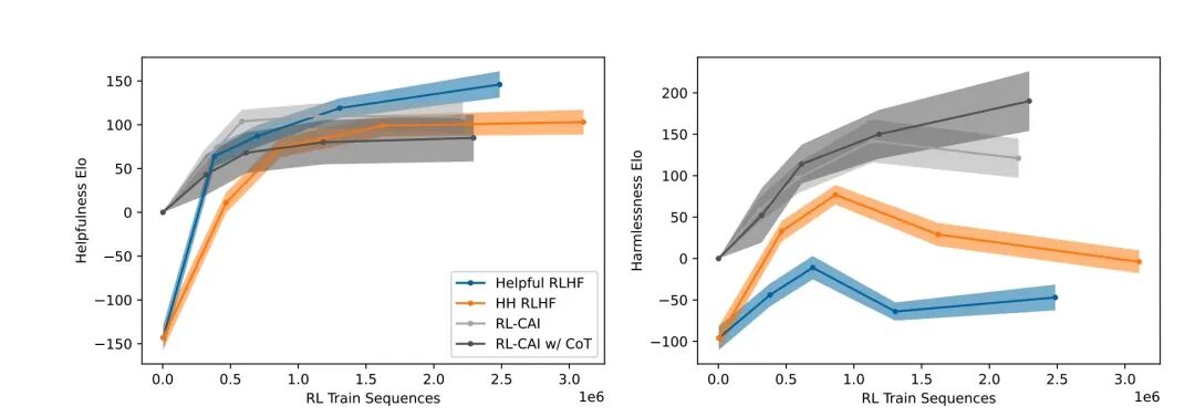 在相同的数据和训练配置下,对比多种强化学习方法,实验发现,RL-CAI(RLAIF) 优于 RLHF 的两种方案,而增加了思维链(CoT)的 RL-CAI 在有用性维度中稍负于 RL-CAI,但在无害性维度提升明显。