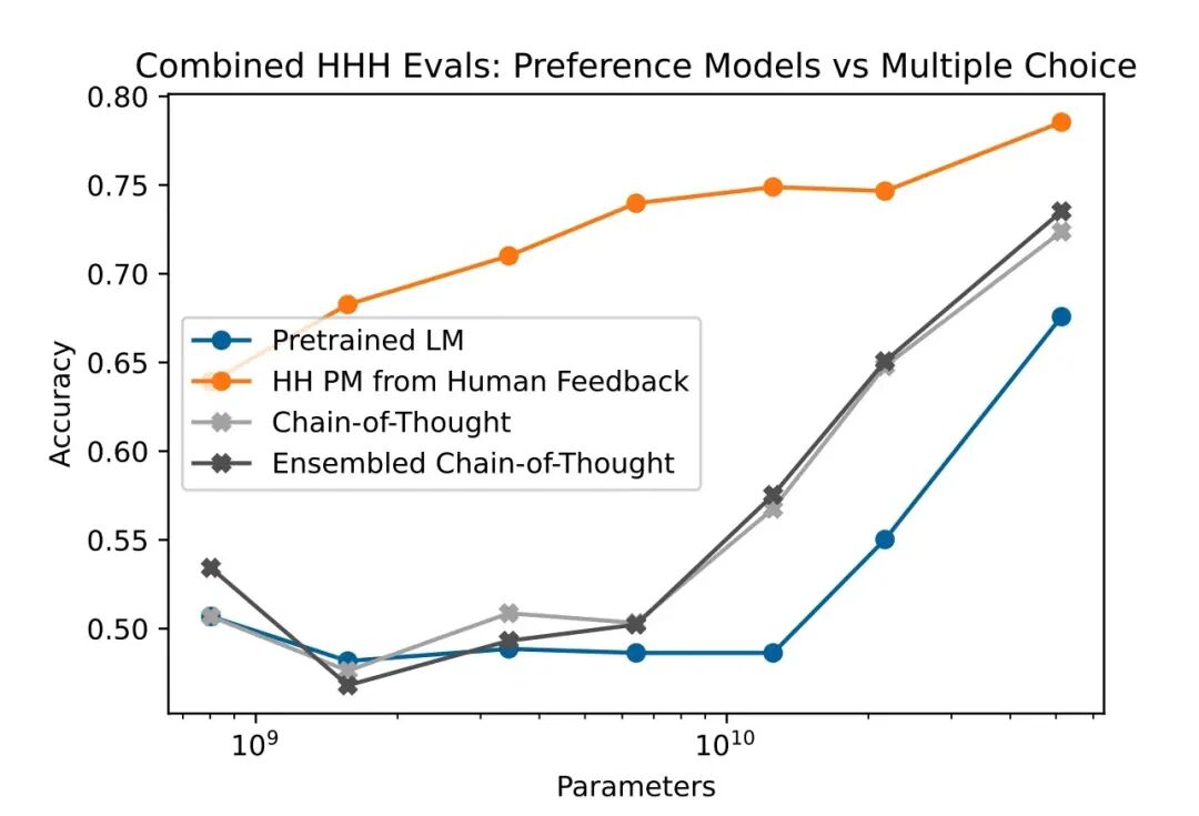 图:对比偏好模型的准确率,测试集合为 438 个单选问题对,评估的 HHH 标准表示有效性(Helpful)、可靠(Honest)和无害性(Harmless)。实验显示,通过使用思维链(CoT)prompting,提升了 AI 的推理能力 ;随着参数量增大,思维链可以将准确率效果提升到媲美人工语料训练的效果。