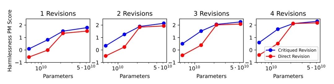 上图纵坐标为 52B 的偏好模型的无害性打分,分数越高说明 Revision 后生成的回答越好。可以看出在不同模型参数量和 Revision 轮数下,Critique 都能提升模型的无害化得分,在小模型上表现更显著。