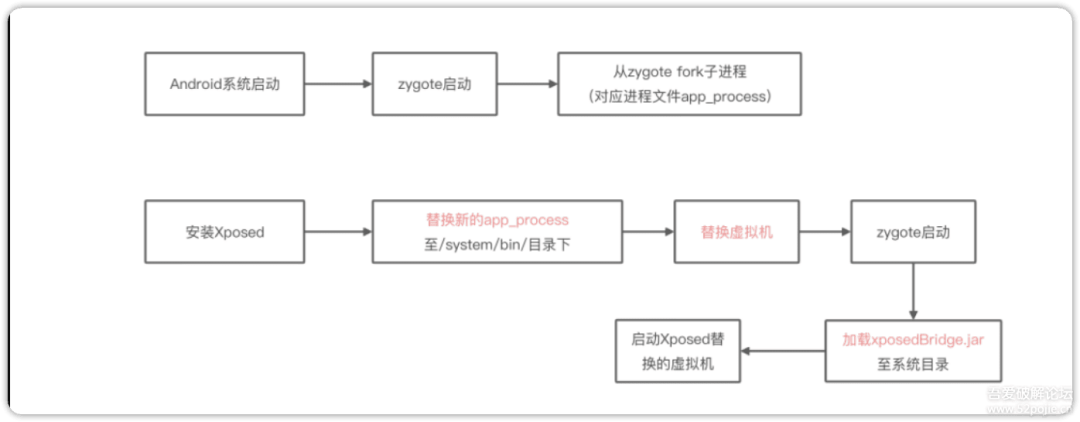 用自己实现的app_process替换掉了系统原本提供的app_process,加载一个额外的jar包,入口从原来的: com.android.internal.osZygoteInit.main()被替换成了: de.robv.android.xposed.XposedBridge.main(),
