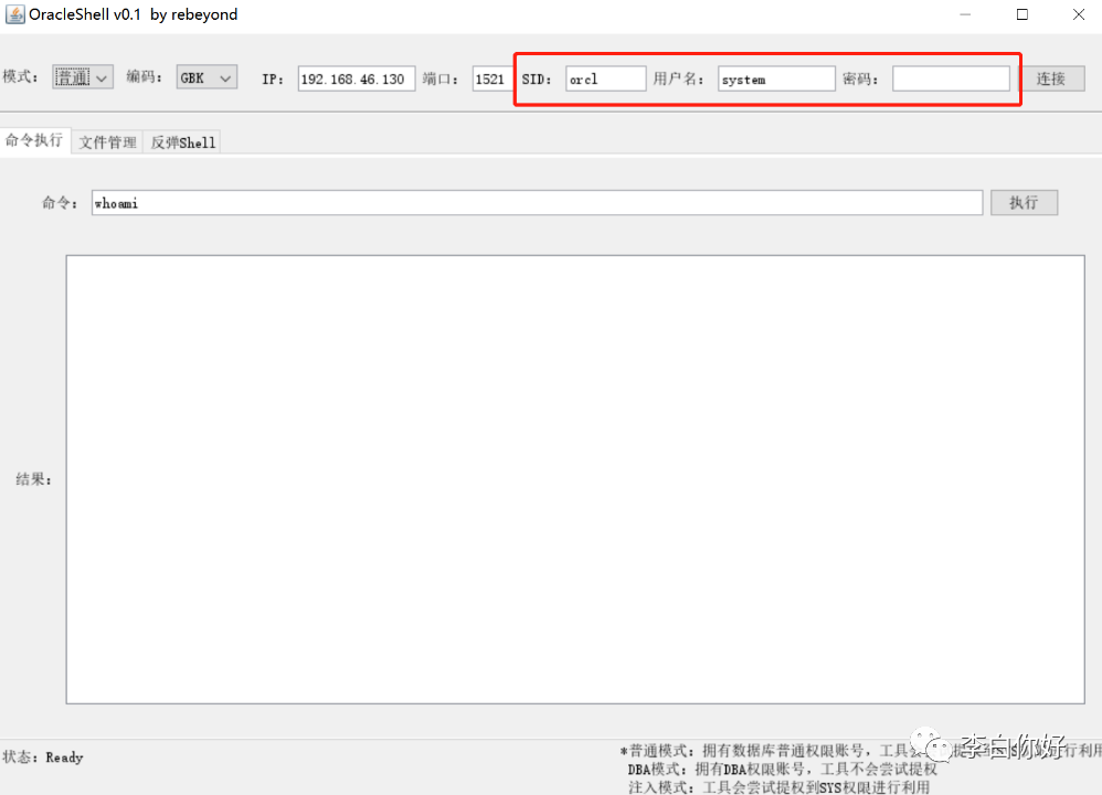 OK!现在已经拥有了IP,PORT,SID,用户名(SYSTEM),密码(SYS),可以直接使用工具连接了。