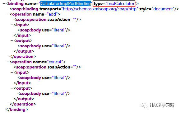 先看最底下的service标签,查看其中port标签的binding属性值,然后通过值查找上面的binding标签: