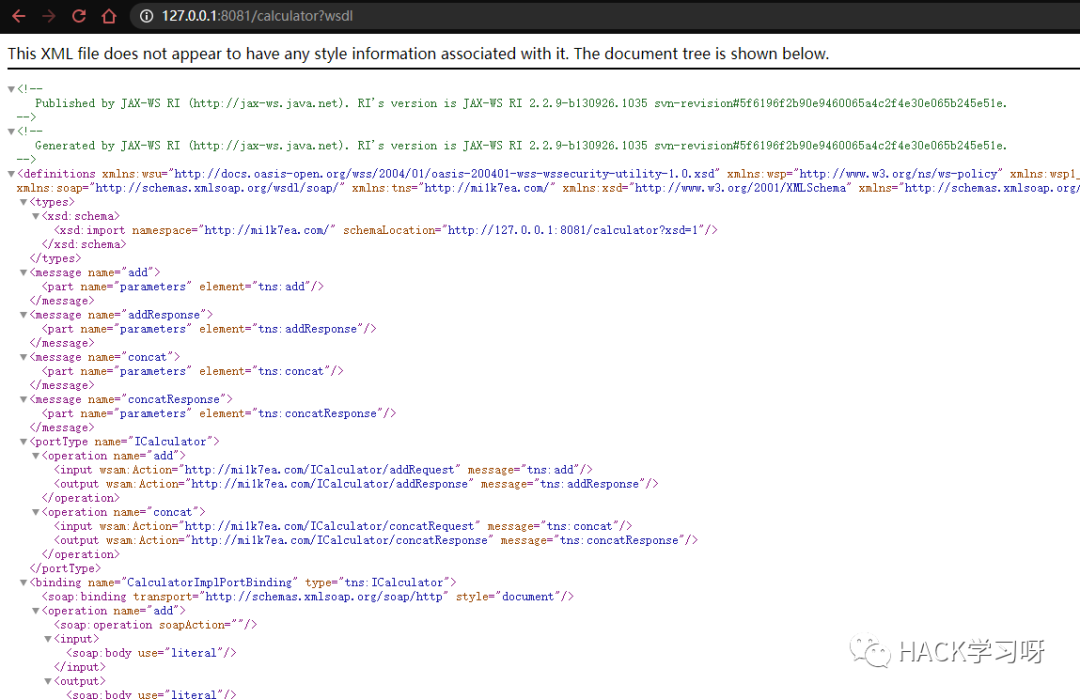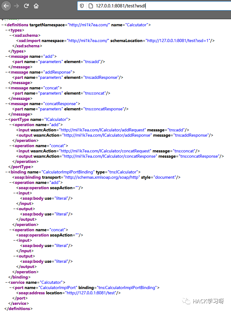 import com.mi1k7ea.CalculatorImpl;import javax.xml.ws.Endpoint;public class WebService {public static void main(String[] args) {System.out.println("[*]Start Web Service...");CalculatorImpl calculator = new CalculatorImpl();String address = "http://127.0.0.1:8081/calculator";Endpoint.publish(address, calculator);System.out.println("[*]Web Service is working...");}}