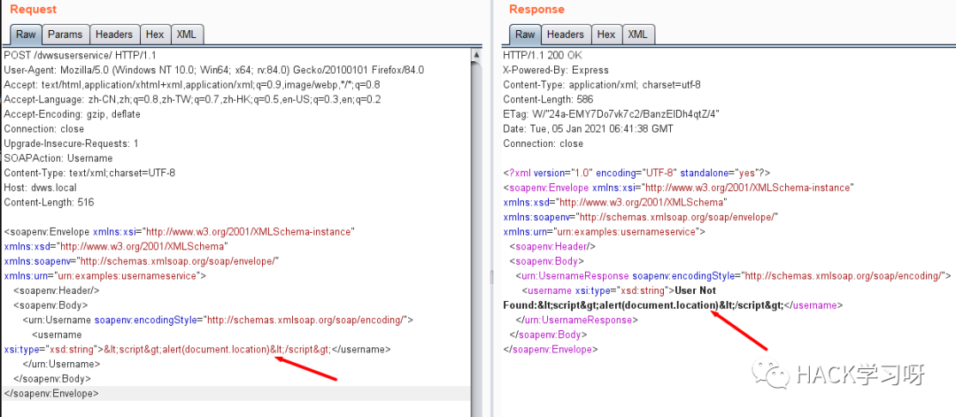 换SOAP请求攻击时,注意点就是在SOAP中XSS payload的尖括号要进行HTML编码,不然会造成SOAP标签解析错误从而报错: