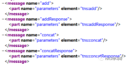 通过portType下的operation标签的message属性,可以向上查找message获取具体的数据参数: