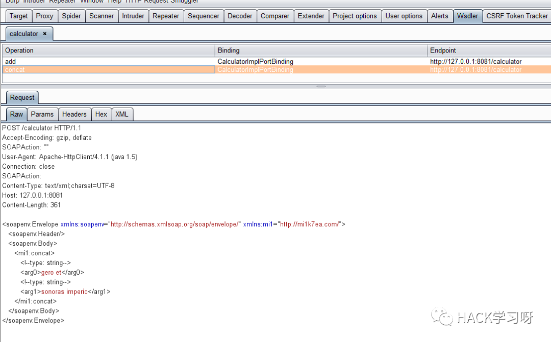 解析WSDL完成之后,在Wsdler栏可以看到解析出来对应的Web Service服务和方法以及对应的请求参数样例等,直接修改对应的参数值即可进行渗透测试: