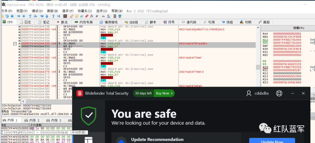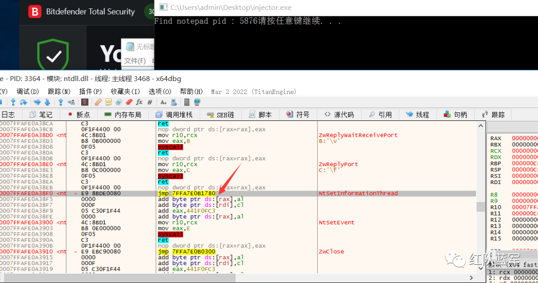使用普通注入情况下,bitdefender直接检测到注入,立即结束了我们的进程和文件。
