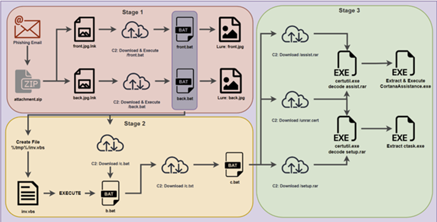 研究人员发现了一种名为PY#RATION的新恶意软件,攻击者可以从受影响的设备上窃取敏感文件并记录击键情况。该恶意软件通过传统的网络钓鱼机制传播,其中电子邮件包含一个受密码保护的ZIP存档。当它被解压缩时,会出现两个快捷图像文件,名称分别为front.jpg.lkn和back.jpg.lnk。当启动时,这些文件会显示不存在的驾照的正面和背面,这样恶意代码也会被行,导致从互联网上下载两个新文件,这些文件的标题分别是front.txt和back.txt,之后重命名为.bat文件并执行。恶意软件伪装成小娜虚拟助手,以确保在系统上持久存在。