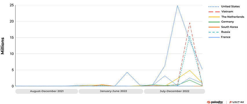 研究人员每月审查数千万条攻击记录,大多数月份针对单个漏洞的攻击不超过攻击总数的10%。然而在2022年8月至2022年10月期间,利用Realtek Jungle SDK远程代码执行漏洞(CVE-2021-35394)的攻击次数占攻击总数的40%以上。12月,研究人员共观察到1.34亿次利用此漏洞的攻击尝试,其中约97%的攻击发生在2022年8月开始之后。