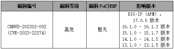 点击上方蓝字关注我们!漏洞背景近日,嘉诚安全监测到F5官方发布了F5 BIG-IP任意代码执行漏洞的安全风险通告,漏洞编号为:CNNVD-202302-092(CVE-2023-22374)。F5 B