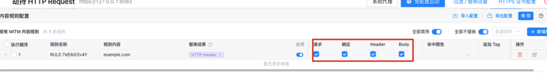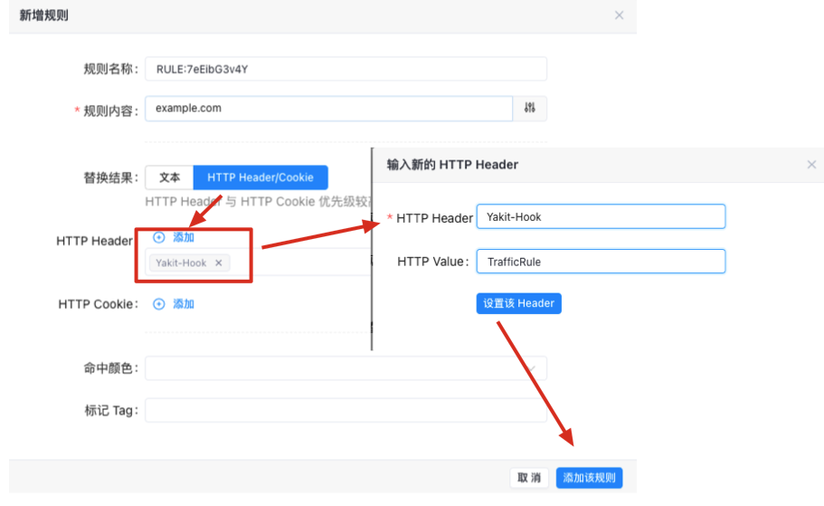 例如我们可以让所有的带有 example.com 的流量请求中新增一个 Header:Yakit-Hook: TrafficRule 其实非常简单,我们只需要在规则表单中编写如下配置: