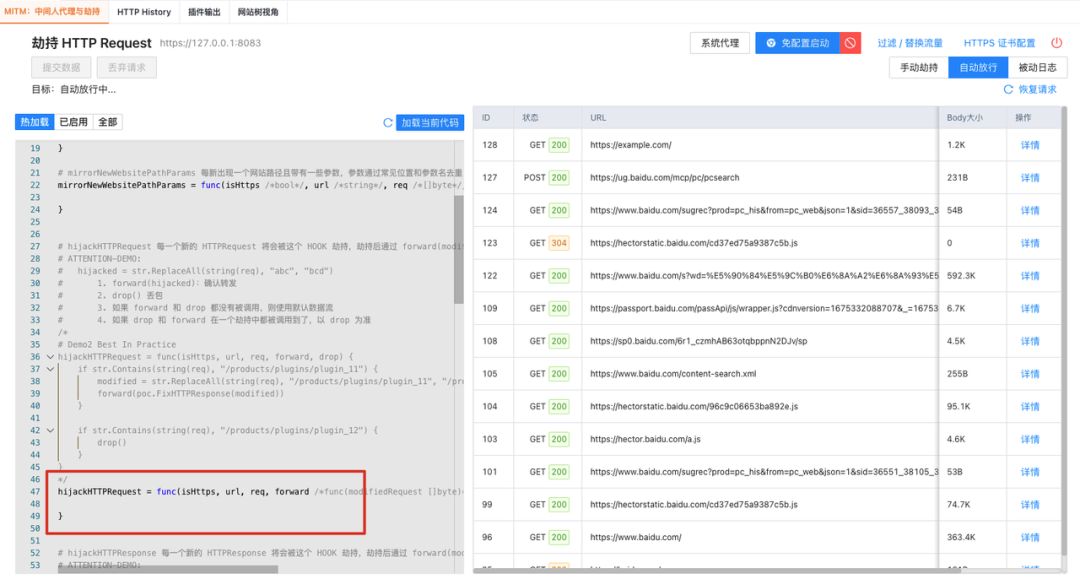 如果要实现流量修改,我们需要找到代码中的hijackHTTPRequest 这个 Hook,这个 Hook 的用法在注释中已经写了一些简单的例子,我们可以实现: