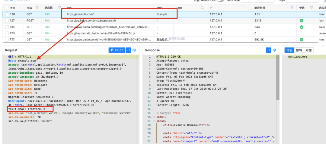 配置好之后,我们访问 example.com 的流量,将会看到在 History 中,example.com 的流量被新增了一个 Header