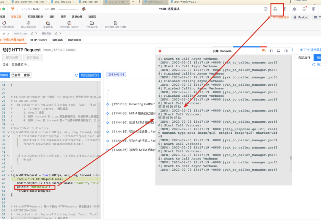 hijackHTTPRequest = func(isHttps, url, req, forward /*func(modifiedRequest []byte)*/, drop /*func()*/) {freq = fuzz.HTTPRequest(req)~modifiedBytes := freq.FuzzGetParams("isAdmin", "true").FirstHTTPRequestBytes()~println("流量修改成功")forward(modifiedBytes)}