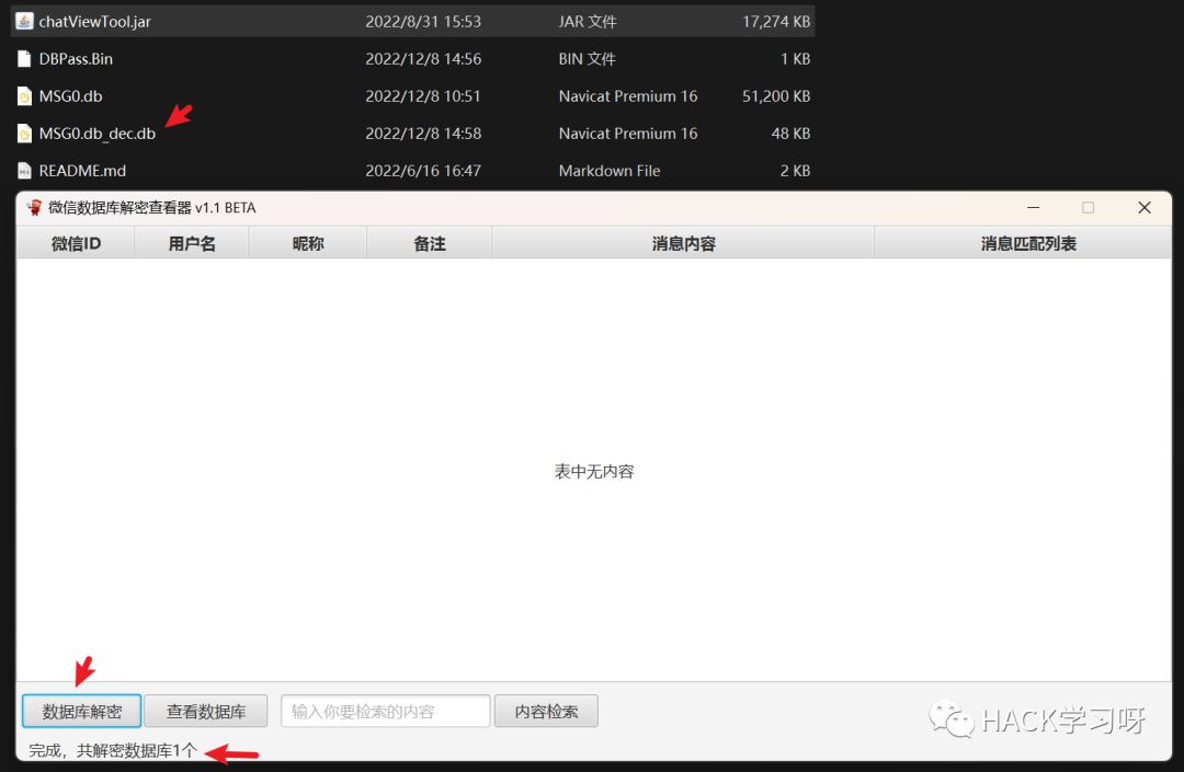 随后打开ChatViewTool点击数据库解密并选择密钥文件DBPass.Bin和聊天记录数据库MSG0.db所在的目录: